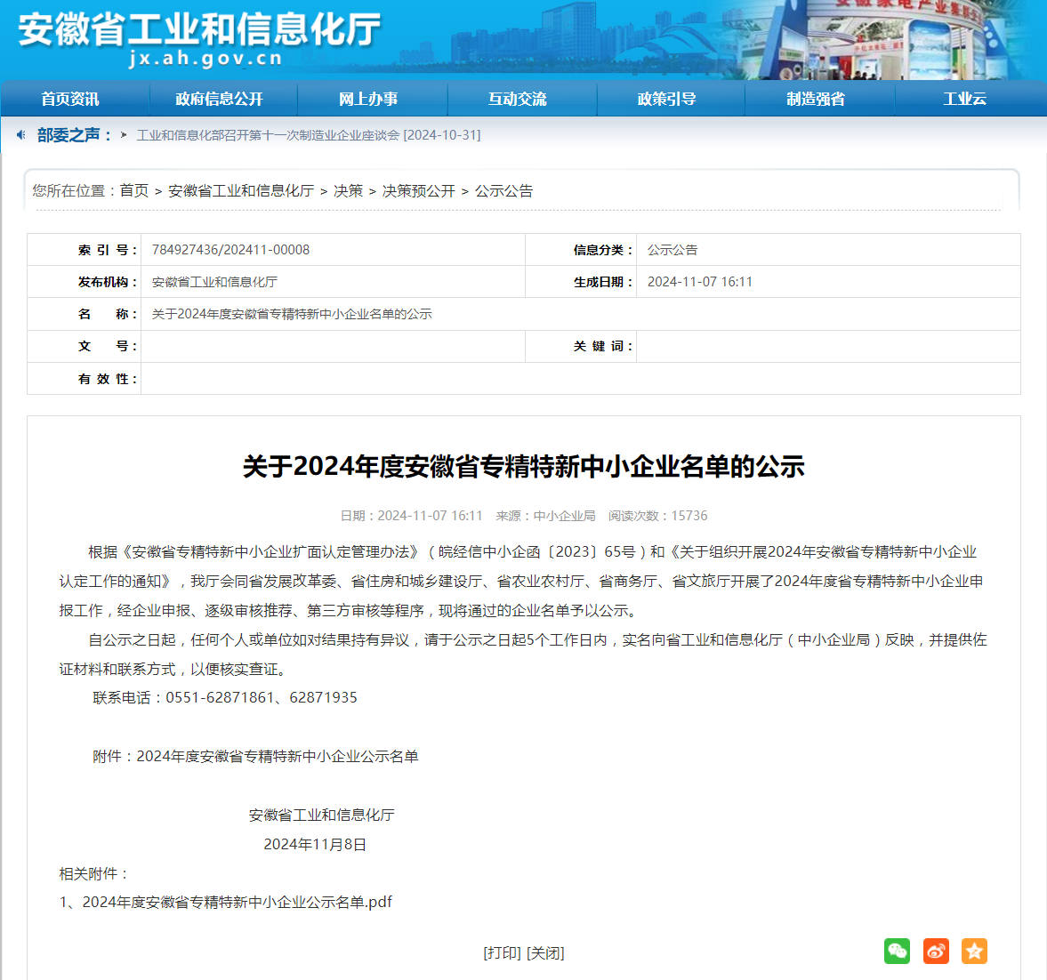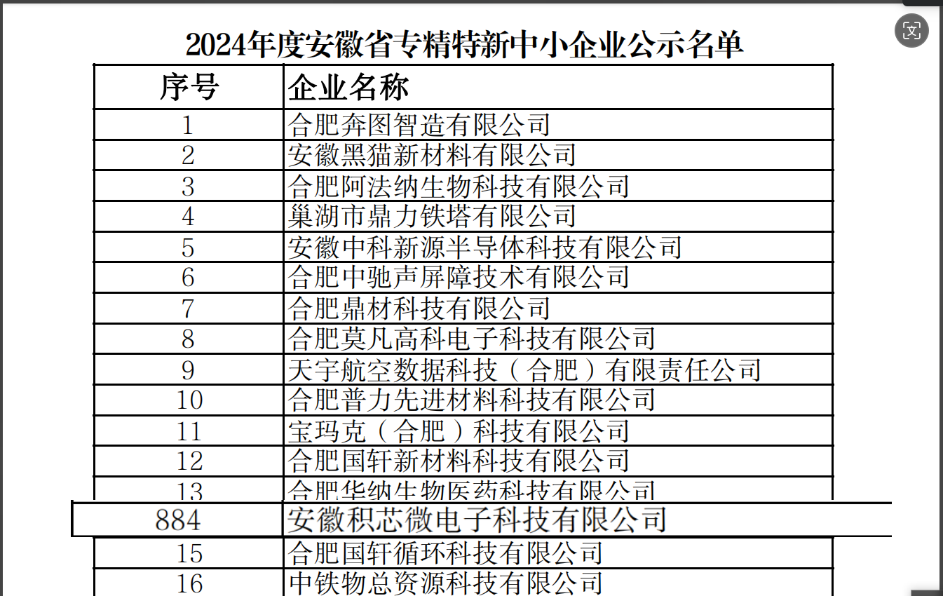 近日,安徽省经济和信息化厅公布了《关于2024年度安徽省“专精特新”中小企业名单》,安徽积芯微电子科技有限公司成功入选,顺利通过安徽省“专精特新”企业认定,标志着积芯微在专业化、精细化、特色化、新颖化的高质量发展道路上稳步向上、持续向好。